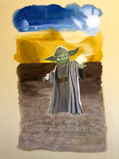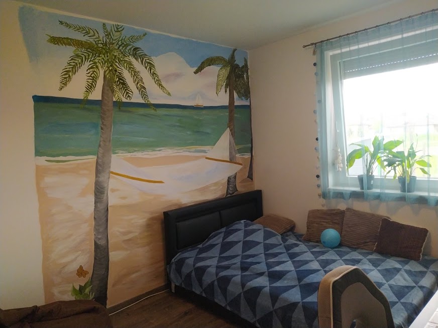 Ha ehhez hasonló festményt szeretnél, valószínűleg három napon keresztül fogok nálad festeni. Mindenképp egyeztessünk elképzeléseidről, hogy pontos árat tudjak neked adni. Katt az „Ilyet álmodtam meg a falamra” gombra!